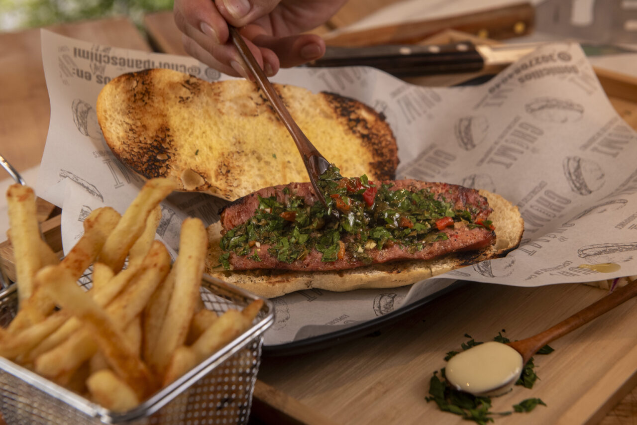 O resultado são chouriços 100% de carne, sem conservantes ou aditivos artificiais. “Não tem adição de proteína de soja nem nada, só carne e gordura mesmo animal. O pão é artesanal e o chimichurri também é feito em casa”, destaca Karina.